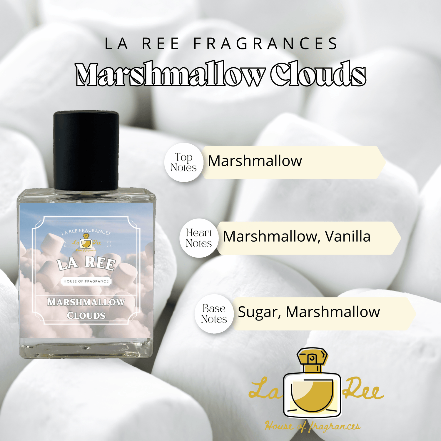 Let yourself be wrapped in sugary softness with Marshmallow Clouds by La Ree Fragrances—a fragrance that feels like floating on vanilla-scented air.
