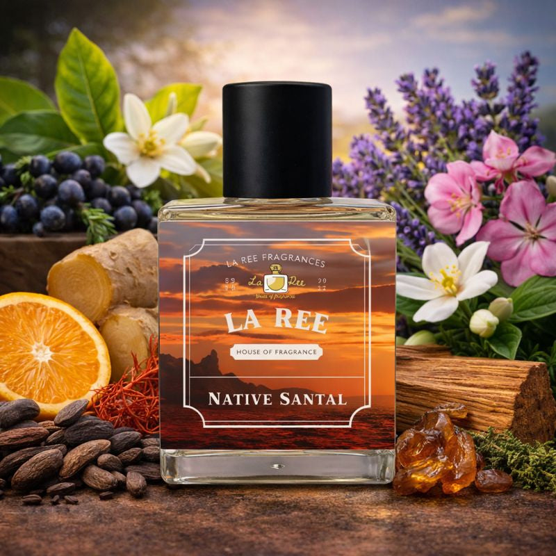 Native Santal by La Ree Fragrances is a modern essential—spiced woods, smooth warmth, and effortless confidence in every spray
